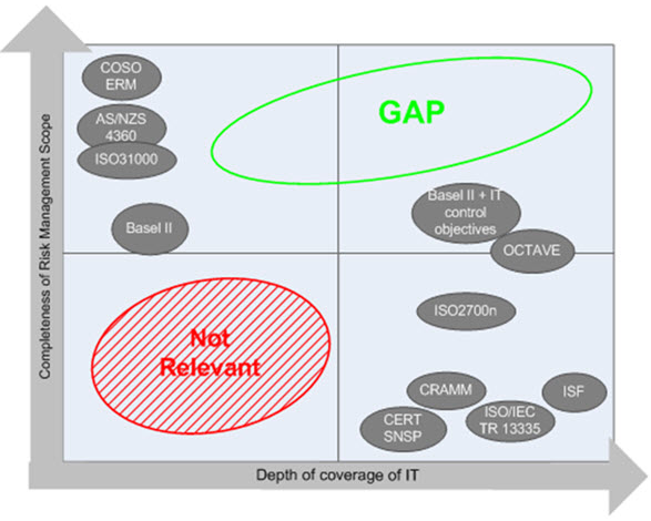 จะสังเกตได้ว่าการบริหารความเสี่ยง (Risk Management) ถือได้ว่าเป็นแกนกลางที่สำคัญมากในการบริหารจัดการองค์กรตามแนวคิด “Integrated GRC” ซึ่งมีความเกี่ยวข้องโดยตรงกับการบริหารความเสี่ยงสารสนเทศ (IT Risk Management) และ การบริหารความเสี่ยงด้านความมั่นคงปลอดภัยสารสนเทศ (Information Security Risk Management) ที่ควรอ้างอิงกับ “Risk IT Framework” ของ ISACA (ดูรูปที่ 12) และ ข้อกำหนดในมาตรฐานISO/IEC 27005 ตามลำดับ (ดูรูปที่ 13) โดย “Risk IT framework” นั้นออกแบบมาเพื่อเป็นการปิดช่องว่าง (Gap) ระหว่าง COSO ERM ที่มองความเสี่ยงทั้งหมดขององค์กรในภาพรวมแต่ไม่ได้เจาะลึกไปในด้านเทคโนโลยีสารนสนเทศ และ การบริหารความเสี่ยงของกระบวนการ ISMS ตามมาตรฐาน ISO/IEC 27001 โดยอ้างอิงกระบวนการโดยละเอียดจากมาตรฐาน ISO/IEC 27005 ที่เจาะลึกในด้านเทคโนโลยีสารสนเทศแต่ไม่ได้มองความเสี่ยงทั้งหมดขององค์กรในภาพรวมเหมือน COSO ERM (ดูรูปที่ 14)