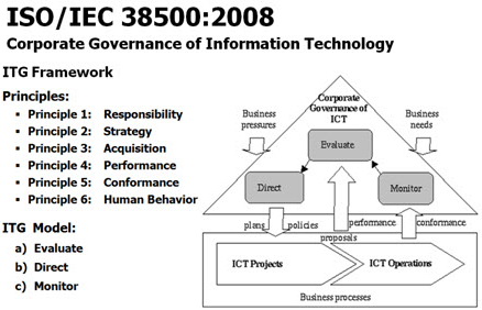 COBIT 5 Framework จาก ISACA (ขณะนี้เปิดให้ download แล้วที่http://www.isaca.org/COBIT ) เป็นการยกเครื่องครั้งใหญ่จากมุมมอง “IT Governance” มาเป็นมุมมอง “Governance and Management of Enterprise IT” โดยได้รับอิทธิพลมาจากมาตรฐาน ISO/IEC 38500 “Corporate Governance of Information Technology” (ดูรูปที่ 1)
