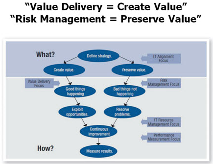 การปรับปรุงจาก CobiT 4.1 Framework เป็น COBIT 5 Framework โดย ISACA นั้น เป็นการยกเครื่องครั้งใหญ่จากมุมมอง “IT Governance” มาเป็นมุมมอง “Governance and Management of Enterprise IT” โดยมุ่งเน้นแนวคิดเรื่อง “Value Delivery” หรือ “Create Value” และ “Risk Management” หรือ “Preserve Value” (ดูรูปที่ 7)