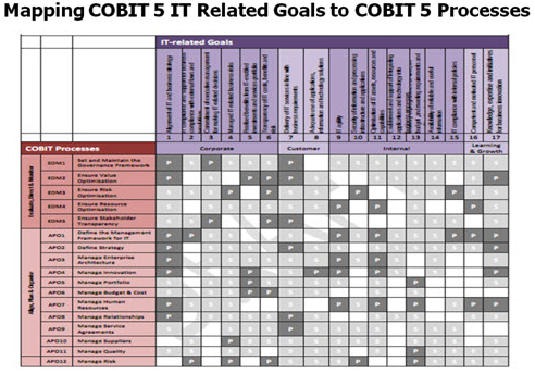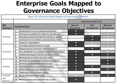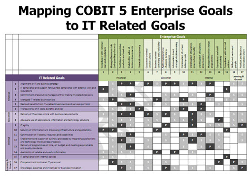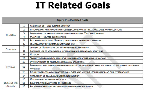 ซึ่งใน COBIT 4.1 Framework, Appendix I “Enterprise Goals” ถูกเรียกว่า “Business Goal” และ “IT Related Goals” ถูกเรียกว่า “IT Goals” ใน COBIT 5 Framework มีการปรับเป็น 17 Business Goals ซึ่ง MAP เข้าสู่ Balanced Scorecard เป็น “Enterprise Goal” และปรับ 28 IT Goal MAP เข้าสู่ Balanced Scorecard เป็น 17 IT Related Goal