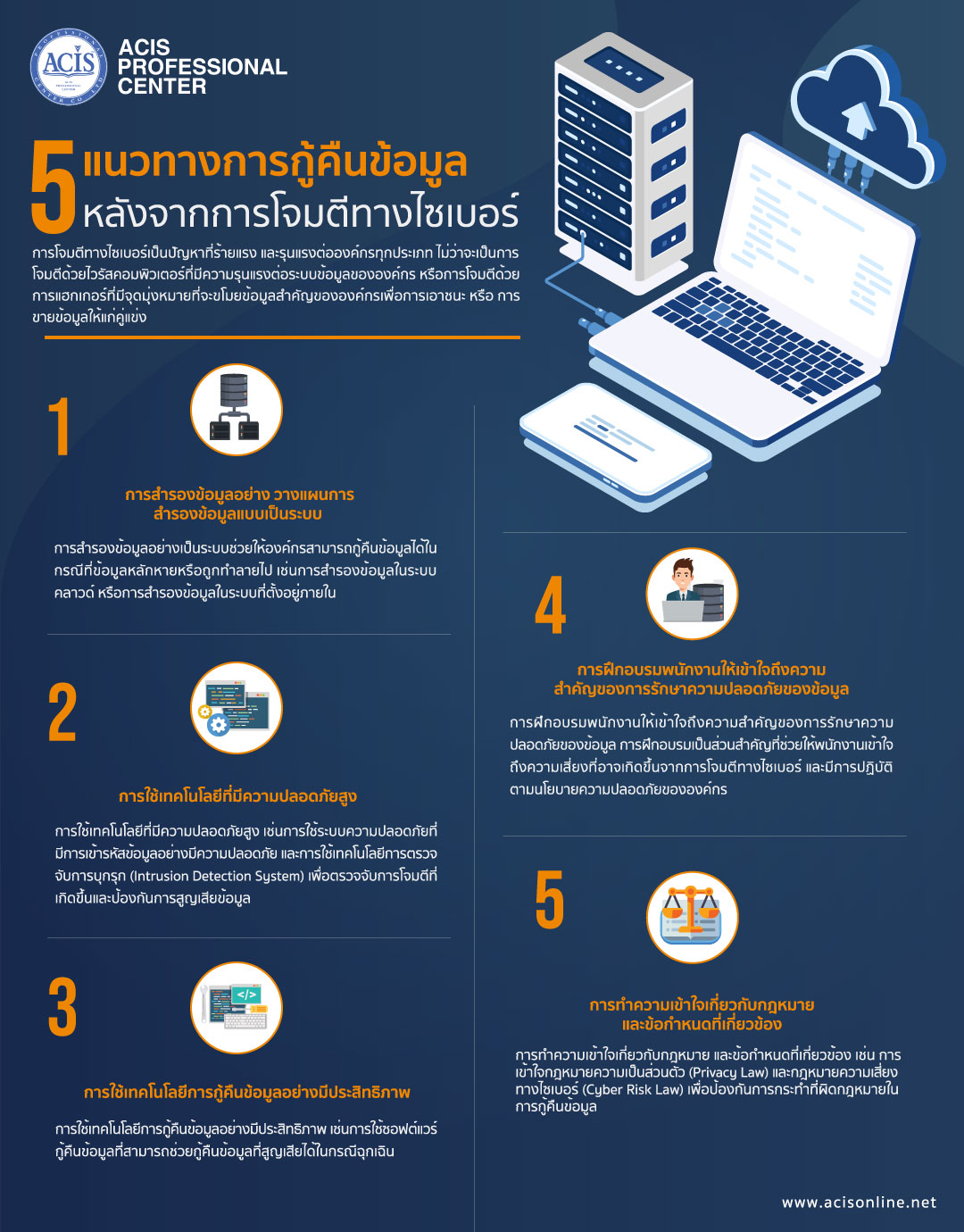 5.การทำความเข้าใจเกี่ยวกับกฎหมายและข้อกำหนดที่เกี่ยวข้อง เช่น การเข้าใจกฎหมายความเป็นส่วนตัว (Privacy Law) และกฎหมายความเสี่ยงทางไซเบอร์ (Cyber Risk Law) เพื่อป้องกันการกระทำที่ผิดกฎหมายในการกู้คืนข้อมูล