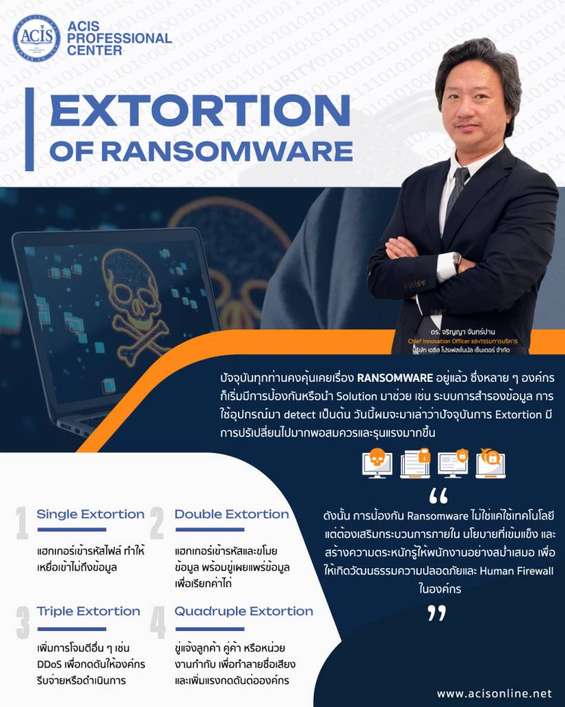 ปัจจุบันทุกท่านคงคุ้นเคยเรื่อง Ransomware อยู่แล้ว ซึ่งหลาย ๆ องค์กรก็เริ่มมีการป้องกันหรือนำ Solution มาช่วย เช่น ระบบการสำรองข้อมูล การใช้อุปกรณ์มา Detect เป็นต้น วันนี้ผมจะมาเล่าว่าปัจจุบันการ Extortion มีการ ปรับเปลี่ยน ไปมากพอสมควรและมีความรุนแรงมากขึ้น