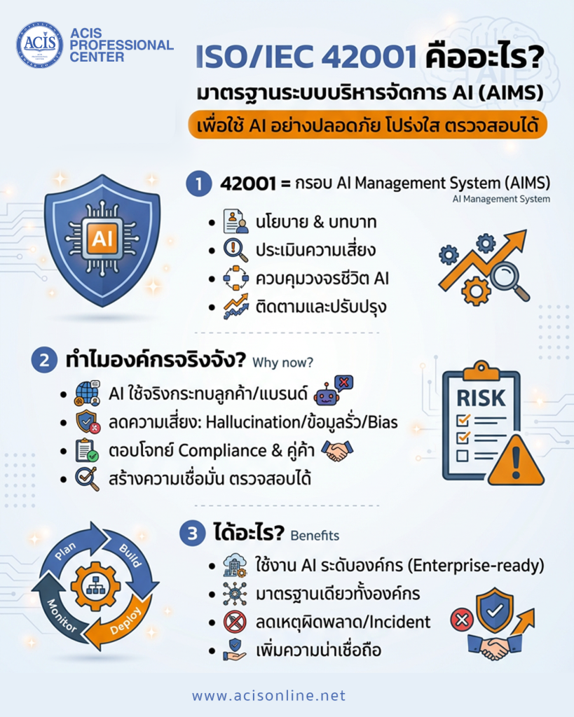 หากองค์กรมี ISO ด้านอื่นอยู่แล้ว (เช่นด้านความมั่นคงปลอดภัยสารสนเทศ/บริการ IT) โครงสร้าง “ระบบบริหารจัดการ” ของ 42001 จะช่วยให้เชื่อมเรื่องบทบาท กระบวนการ และการตรวจติดตามเข้าหากันได้ง่ายขึ้น