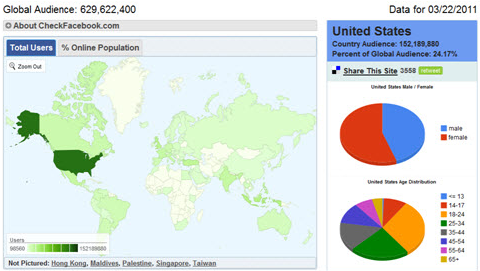 ในปัจจุบันมีผู้ใช้งาน Facebook ทั่วโลกถึง 629,622,400 คน ณ วันที่ 22/3/2554 (ดูรูปที่ 2)