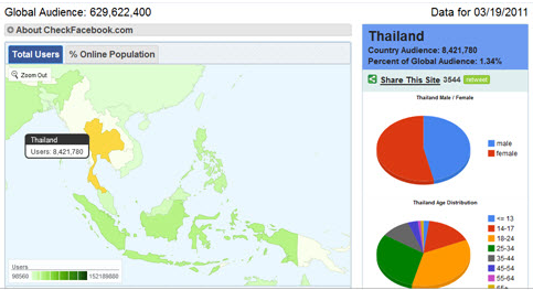 โดยประเทศไทยเป็นประเทศลำดับที่ 19 ของโลกในการใช้งาน Facebook ถึง 8,421,780 คน ณ วันที่ 19/3/2554 (ดูรูปที่ 3)