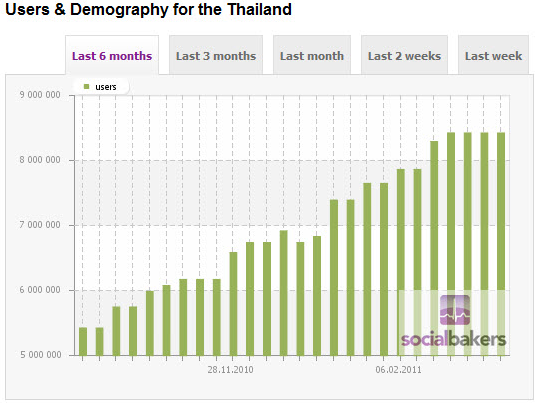 ประเทศไทยมีอัตราการเจริญเติบโตการใช้งาน Facebook แบบก้าวกระโดดจากปลายปีที่แล้วประมาณห้าล้านคนมาปัจจุบันเข้าใกล้เก้าล้านคนเข้าไปแล้ว (ดูรูปที่ 6)
