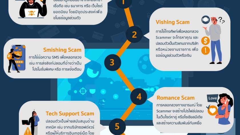 Vishing Scam Vishing คือการใช้โทรศัพท์เพื่อหลอกลวง Scammer จะโทรหาคุณและปลอมตัวเป็นตัวแทนจากบริษัทหรือหน่วยงานราชการ เพื่อขอข้อมูลส่วนตัวหรือเงิน วิธีป้องกันคืออย่าให้ข้อมูลสำคัญทางโทรศัพท์ และโทรกลับหาบริษัทหรือหน่วยงานนั้นๆ เพื่อยืนยันว่ามีการติดต่อจริงหรือไม่