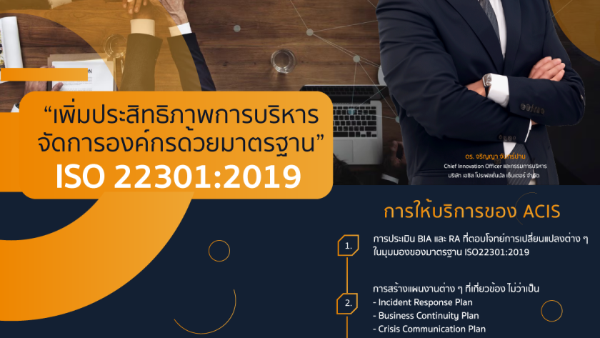 ISO 22301:2019 (Business Continuity Management) เป็นมาตรฐานให้องค์กรมีการบริหารจัดการแบบองค์รวม และเป็นกรอบการสร้างขีดความสามารถให้องค์กรมีความยืดหยุ่น เพื่อตอบสนองและปกป้องผลประโยชน์ของผู้มีส่วนได้ส่วนเสียหลัก ชื่อเสียงและกิจกรรมที่สร้างมูลค่าที่มีประสิทธิผล