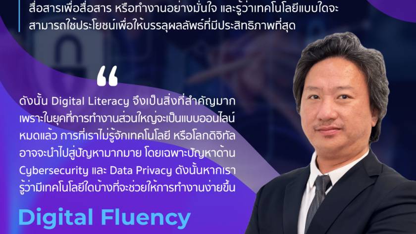 Digital Literacy Digital Literacy หมายถึง ทักษะ หรือความสามารถพื้นฐานในการใช้เทคโนโลยีสารสนเทศ และการสื่อสารเพื่อสื่อสาร หรือทำงานอย่างมั่นใจ และรู้ว่าเทคโนโลยีแบบใดจะสามารถใช้ประโยชน์เพื่อให้บรรลุผลลัพธ์ที่มีประสิทธิภาพที่สุด ดังนั้น Digital Literacy จึงเป็นสิ่งที่สำคัญมาก เพราะในยุคที่การทำงานส่วนใหญ่จะเป็นแบบออนไลน์หมดแล้ว การที่เราไม่รู้จักเทคโนโลยี หรือโลกดิจิทัลอาจจะนำไปสู่ปัญหามากมาย โดยเฉพาะปัญหาด้าน Cybersecurity และ Data Privacy ดังนั้นหากเรารู้ว่ามีเทคโนโลยีใดบ้างที่จะช่วยให้การทำงานง่ายขึ้น และหากข้อมูลของเรารั่วไหล เราจะใช้เทคโนโลยีใดในการตามข้อมูลกลับมา หรือแม้แต่การป้องกัน/ปิดกั้นไม่ให้สามารถเข้าถึงข้อมูลที่มีความสำคัญได้ เป็นต้น โดยเฉพาะปัจจุบันการใช้งานเทคโนโลยีได้เข้าถึงคนทุกระดับ คนทุกวัย อย่างหลีกเลี่ยงไม่ได้ เช่น การใช้ Internet Banking ในธุรกรรมต่าง ๆ การใช้ Application ของภาครัฐ และเอกชนเพื่อเข้าถึงสวัสดิการ เป็นต้น ไม่ว่าจะช้าหรือเร็ว สุดท้ายเราก็ต้องเรียนรู้ทักษะดิจิทัลและต้องมีความเข้าใจเรื่องเทคโนโลยีอยู่ดี อีกศัพท์หนึ่งที่เริ่มมีการพูดถึงการมากขึ้น คือ Digital Fluency แล้วต่างกันอย่างไรกับ Digital Literacy จุดที่ต่างกันคือ…