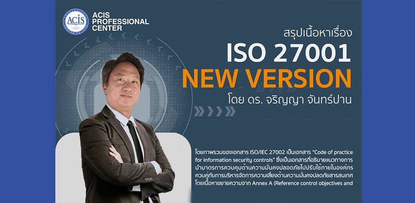 ดร. จริญญา จันทร์ปาน Chief Innovation Officer และกรรมการบริหารของบริษัท เอซิส โปรเฟสชั่นนัล เซ็นเตอร์ จำกัด ได้มีการจัดสัมมนาในเรื่อง ISO 27001 New version ไปเมื่อปีที่แล้ว โดยเนื้อหาโดยสรุปมีดังนี้