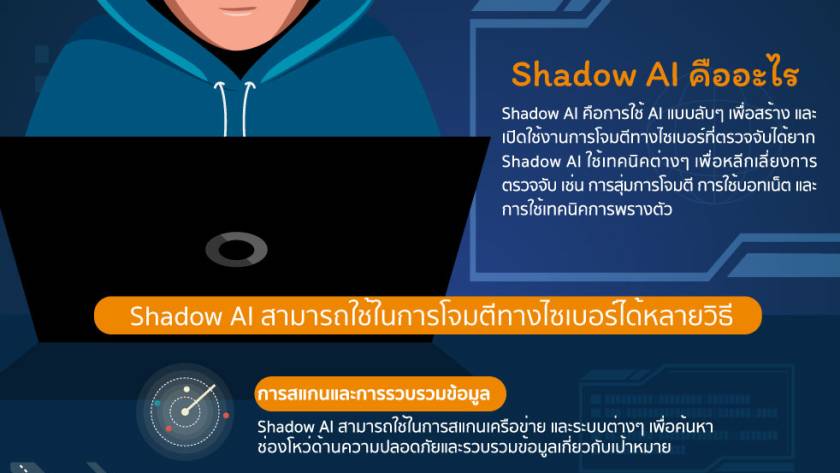 Shadow AI คือการใช้ AI แบบลับๆ เพื่อสร้างและเปิดใช้งานการโจมตีทางไซเบอร์ที่ตรวจจับได้ยาก Shadow AI ใช้เทคนิคต่างๆ เพื่อหลีกเลี่ยงการตรวจจับ เช่น การสุ่มการโจมตี การใช้บอทเน็ต และการใช้เทคนิคการพรางตัว